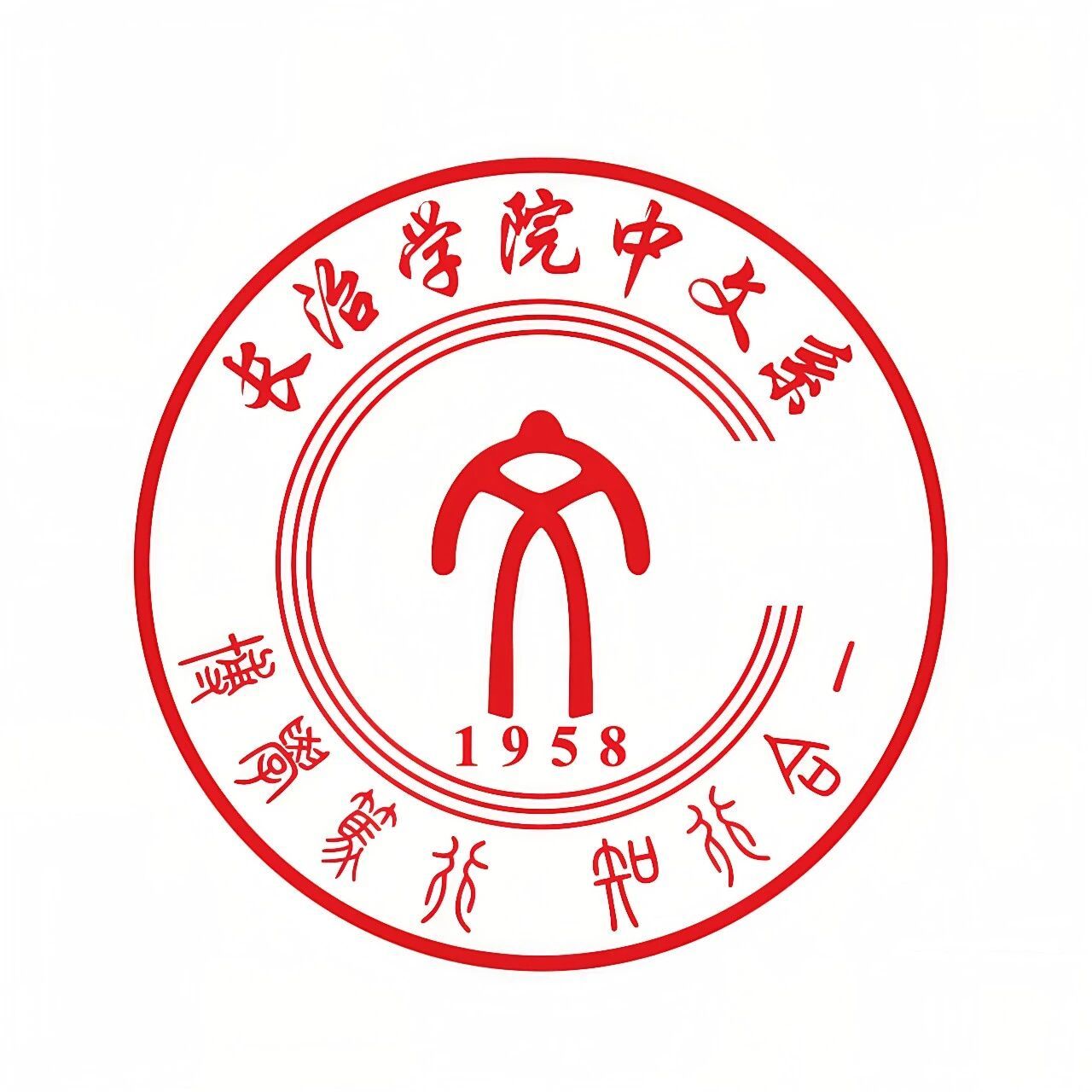 核心篆文文字,居中而立,凝练中文系以文化人、文以载道之根本,是立系之魂、育人之本。下方1958,铭记系部设置之始,承载六十余载办学积淀与薪火相传。